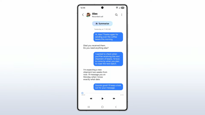 Galaxy AI 也不仅引入了 AI 通话摘要,还采用了对话式的文本设计——用类似短信的文本对话「还原」通话中双方所说的话,这一点可能也值得其他手机厂商借鉴。